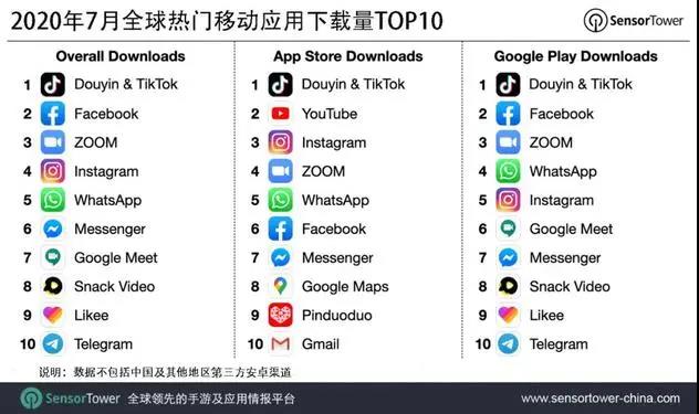 據(jù)Sensor Tower商店情報數(shù)據(jù)顯示,2020年7月,抖音及海外版TikTok以超過6520萬次下載量,繼續(xù)位列*移動應用(非游戲)下載榜*。